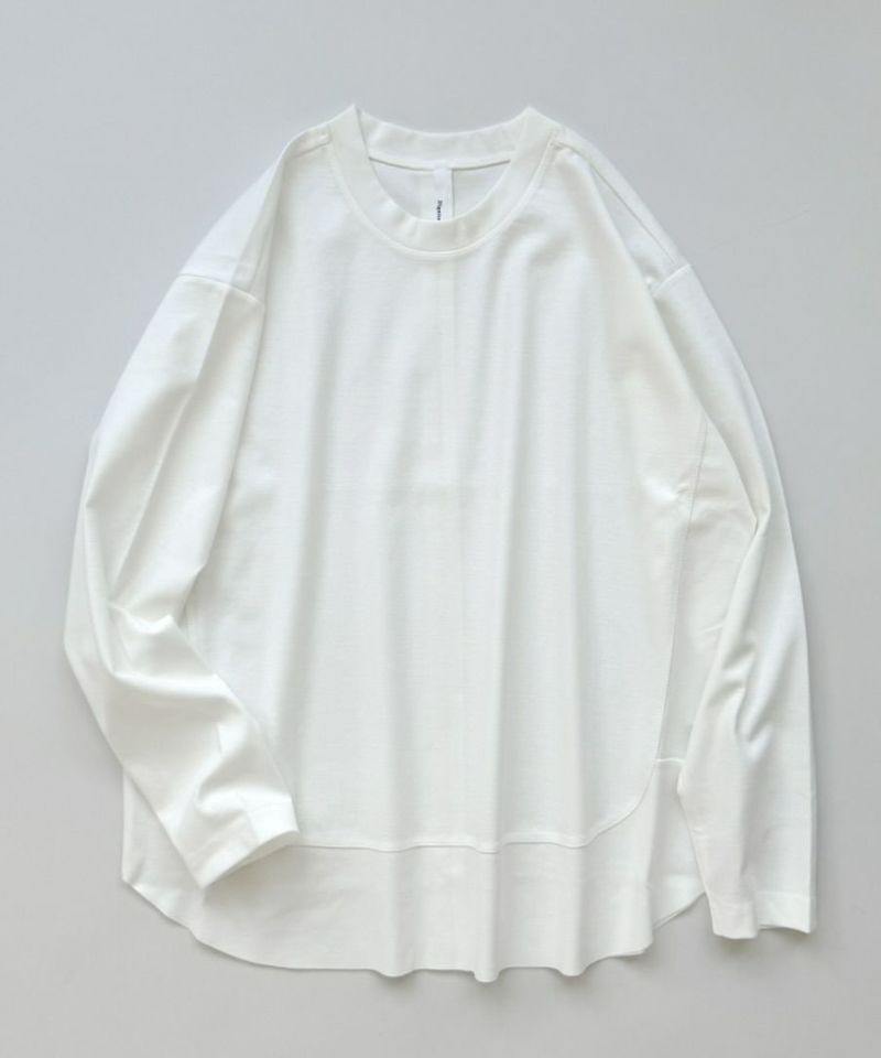 春夏に人気だった裾ラウンド裾切り替えTeeの長袖バージョンが入荷しました!ポリエステルコットンのハリ感のある綺麗見えしてくれる生地。シンプルながら、バックスタイル裾のスリットや切り替え、ラウンドになった切りっぱなしの裾のラインがアクセントになった一枚。透けにくく、体のラインを拾いにくい程よいサイズ感なので、1枚着はもちろん、ジャケットやブルゾンのインナー使いにも重宝します。シンプルにオシャレを楽しみたい方におすすめの大人のTシャツです。