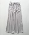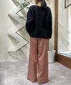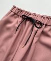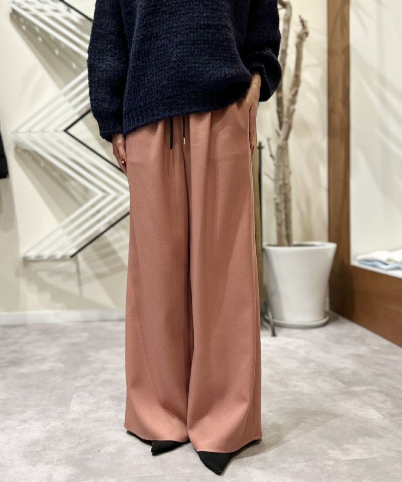 程良い温かみと膨らみのあるウールライク素材を使用したワイドーパンツ。ウエストゴム仕様のイージーな履き心地。ウエスト部分の配色になったブラックの紐がアクセントになっています。※バックポケット付き、サイドポケット付き、裏地無し。