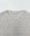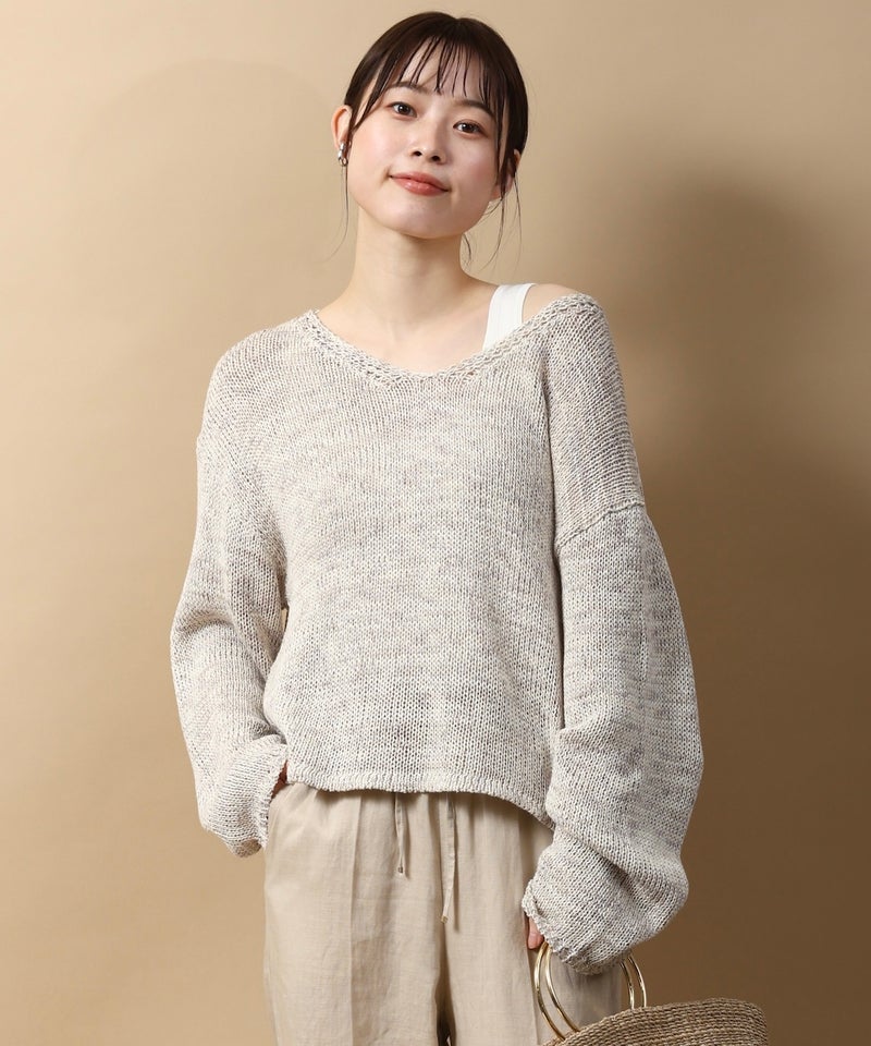 奥行きと表面感のあるメランジニット素材を使用したVネックニット。コンパクトな着丈に緩めの袖丈が好バランス。長袖ながら綿混素材でさらりと清涼感があり軽い着心地も魅力です。