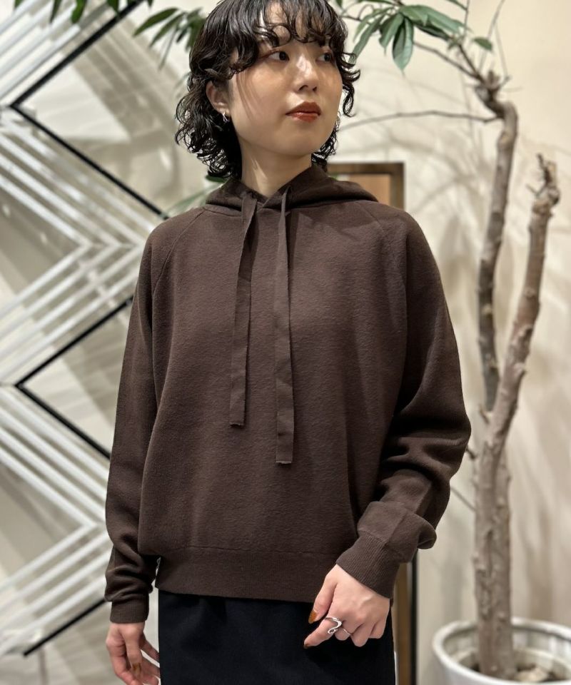 もっちりと柔らかく肌触りの良いノンウール素材を使用したフーディーニット。今年らしくフード部分の紐を太めの平紐にリニューアル。カーブを付けた前裾のラインで前後差があり、着た時の自然な丸みが魅力です。