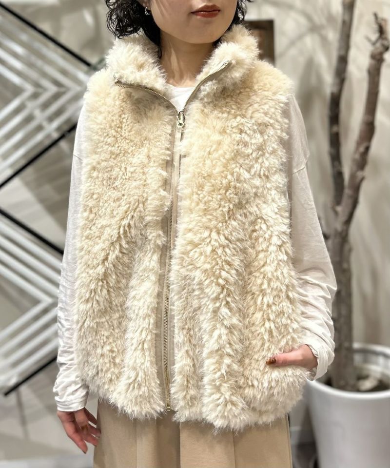 肌触りの良いふわふわのエコファー素材を使用したスタンドカラーのベスト。毛足の長さの異なるエコファーをミックスしたデザイン。シンプルなスタイリングに一枚取り入れるだけで華やかな印象に。ジップ部分の長めのリボンもアクセントになっています。裾のコードを絞ってシルエットの調節が可能です。※フロントジップ付き、裏地付き、ポケット付き。
