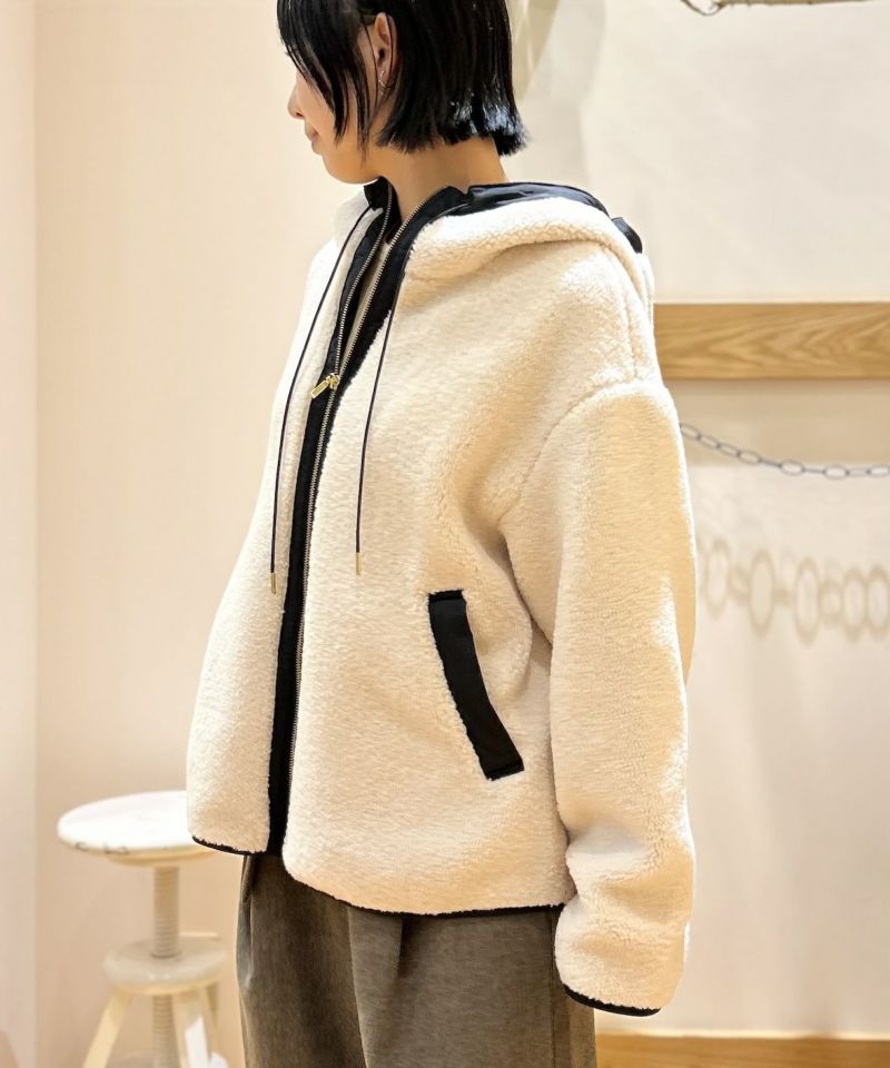 短毛のモコモコのボア素材を全体に使用したフード付きブルゾン。バックスタイルや袖、襟元やフード内、ジップ部分やポケット部分などのパイピングやタフタ素材の切り替えがアクセントにに。やや前後差のある着丈と自然な丸みを帯びたシルエットも魅力的。ゆとりのある袖のデザインで、袖通しも良く、実用性も兼ね備えたアイテムです。