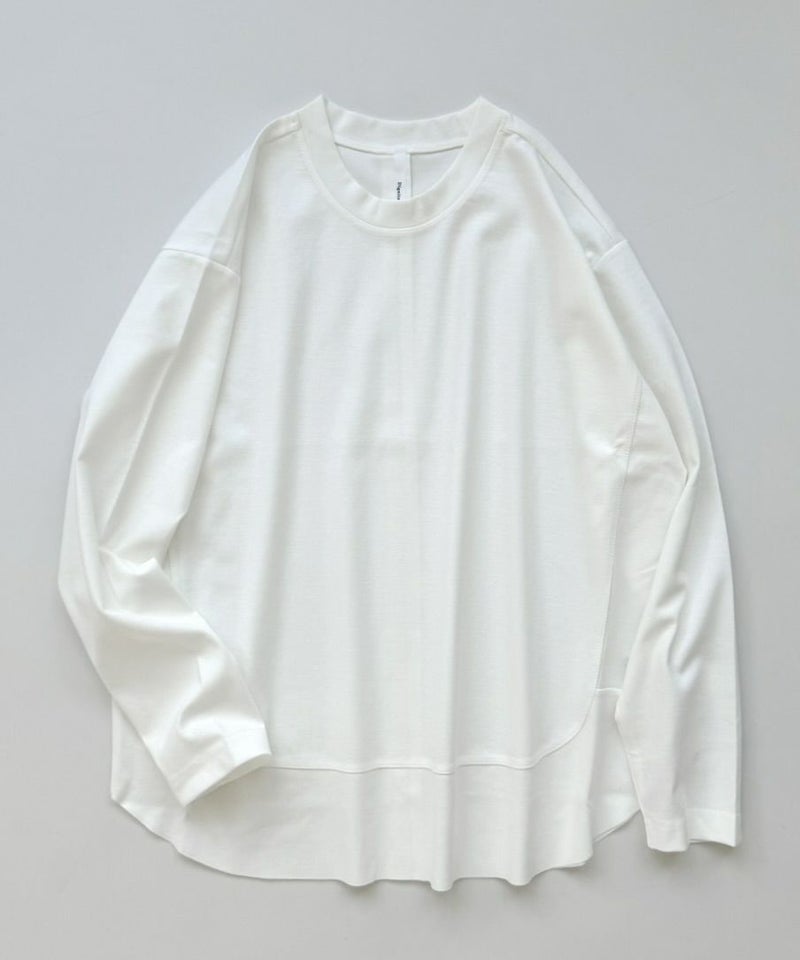 春夏に人気だった裾ラウンド裾切り替えTeeの長袖バージョンが入荷しました!ポリエステルコットンのハリ感のある綺麗見えしてくれる生地。シンプルながら、バックスタイル裾のスリットや切り替え、ラウンドになった切りっぱなしの裾のラインがアクセントになった一枚。透けにくく、体のラインを拾いにくい程よいサイズ感なので、1枚着はもちろん、ジャケットやブルゾンのインナー使いにも重宝します。シンプルにオシャレを楽しみたい方におすすめの大人のTシャツです。
