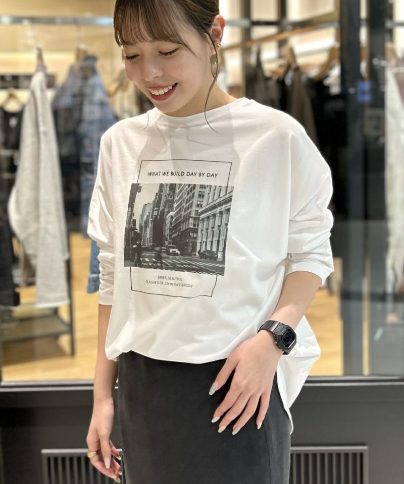 モノクロのフォトプリントとシンプルなプリントが大人っぽいロンT。気分やスタイリングに合わせてお好きな面で着用可能な前後2way仕様です。