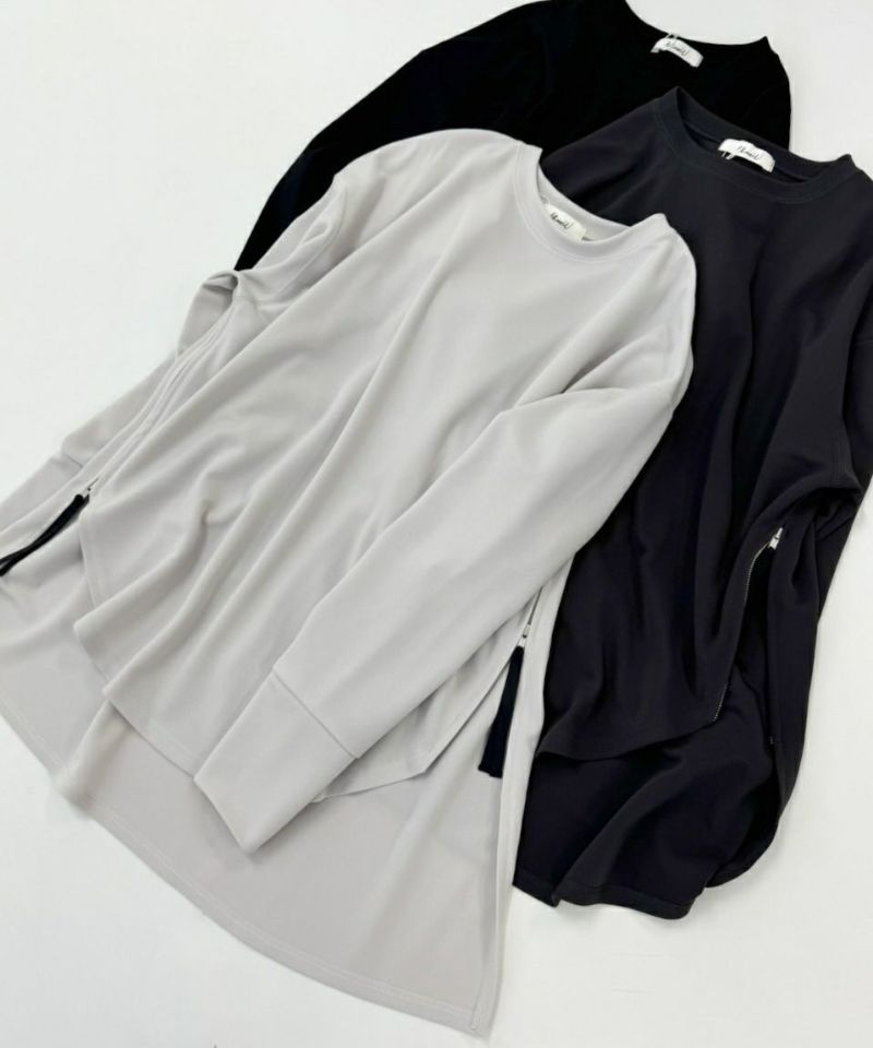 ポリエステル強撚糸を使用したダンボール素材で膨らみはありつつ、さらりとした着心地の綺麗見えするカットソー。シンプルながら、サイドジップがアクセントになった一枚。ジップ部分のリボンテープの配色もポイント(ブラックのみ同色)。一枚着るだけでサマになり、季節の変わり目にも重宝するアイテムです。
