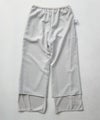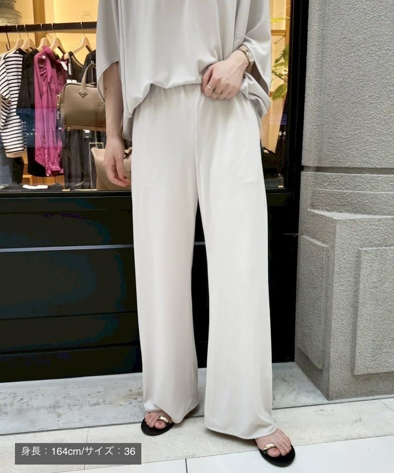 接触冷感・UVカット・防シワの夏に最適な機能性素材を使用したイージーパンツ。外側のサイドに縫い目の無い自然なフレアシルエット、とろみと落ち感のある上品な生地感が魅力。ウエスト部分は紐やタックを無くしスッキリとしたシンプルなデザイン。ウエストゴム仕様のイージーな履き心地ながら、きちんと感があり、Tシャツなどカジュアルなアイテム合わせも綺麗にまとめてくれる、上品な着こなしが叶うアイテムです。透け防止の裏地は暑い日にも着用可能な薄手のさらりとした素材です。※着丈の異なる2サイズ展開で、身長や好みに合わせて着用していただけます。同素材のトップス(品番:3050-MNWJJ15647A)とセットアップでの着用も可能です。※オイスター・ブラック共に裏地付き、ポケット付き。