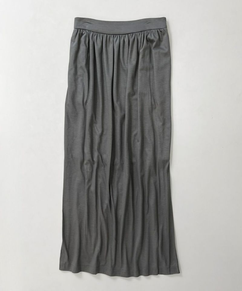 しなやかなテンセル素材を使用したカットソー生地のロングスカート。スッキリ見えしつつ、ウエストにギャザーを施しタイト過ぎないシルエットに仕上げた一枚。伸縮性もあり、ウエストゴムのイージーな履き心地、さらりとした肌触りで暑い季節にもおすすめ。程良いカジュアルさと上品さを兼ね備えたアイテムです。※膝上部分裏地有り、バックスリット入り。