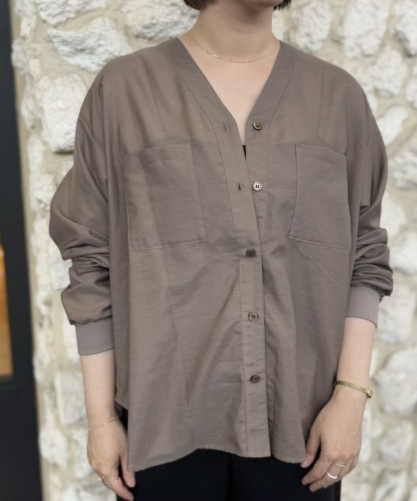 国内のシアー生地を使用したVネックのノーカラーブラウス。袖口にリブを施し程良くカジュアル感をプラスしつつ、スッキリとしたネックラインと素材感が大人っぽい印象。ちょっとした羽織にも重宝するアイテムです。