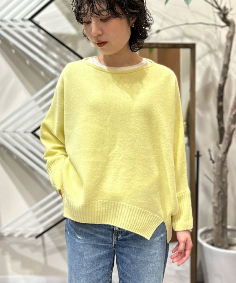 カシミヤのようなふっくらとした肌触りの良い質感が魅力の上質ウールニット。ボートネックとドルマンスリーブでリラクシーに女性らしく着こなせる一枚。裾のスリットがアクセントになっています。厚すぎない程良い肉感、軽い気心地も魅力です。