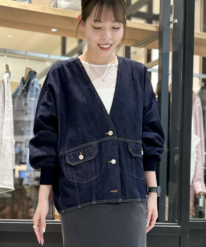 丸みのあるシルエットと短めの着丈が可愛らしい、デニムジャケット。厚すぎない程良い生地感で、シャツ感覚で着用可能。スッキリと開いたVネックデザイン、袖口のリブ使いや、低めのポケットやステッチ位置など、ディテールの効いた一枚です。