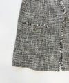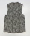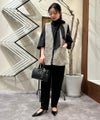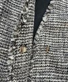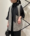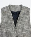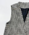 凹凸のある表面感、ラメ糸が入った杢色のトライスピンツイード素材を使用したジレ。深めのVネックデザインに広めのアームホールでボウタイやフリル付きのブラウスなど、デザインのあるインナーとも相性抜群。ネックラインやポケットのフリンジデザインで華やかさはありつつ、固すぎずファッショナブルな印象を与えてくれます。フォーマルから日常使いまで様々なスタイリングが楽しめる一枚です。※裏地付き、ポケット付き。