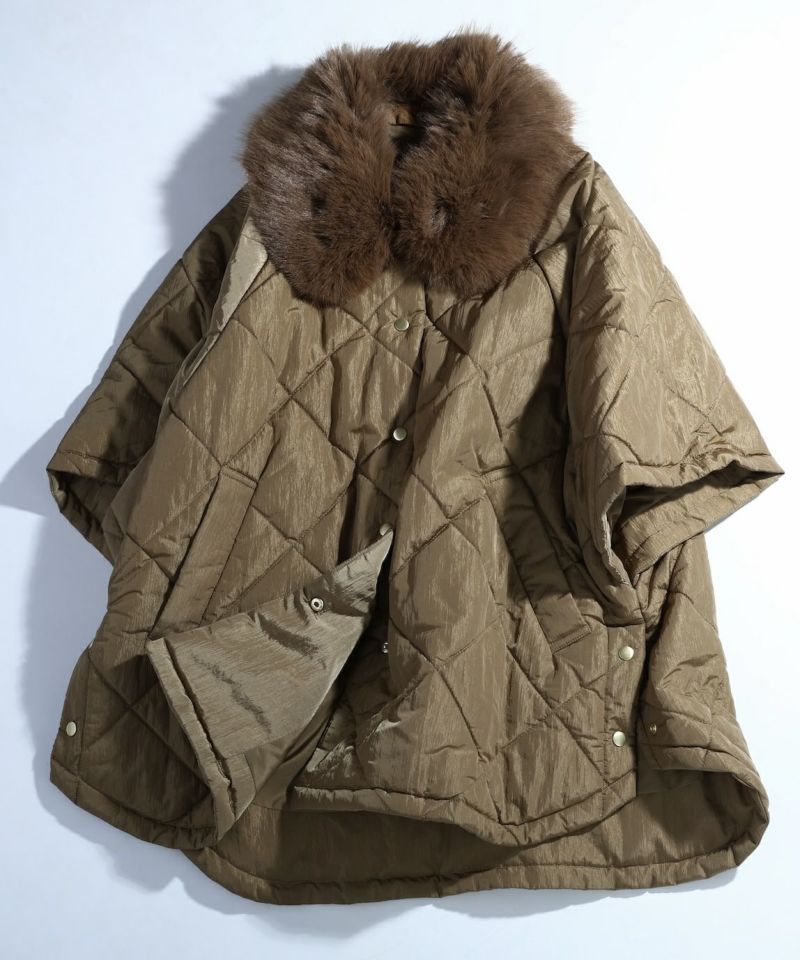 シボ感のあるナイロン素材を使用したナチュラルで柔らかな印象のキルティングアウター。コーディネートの幅が広がる、ロンTやシャツの上に軽めに羽織りやすいポンチョ型。従来のトラッド色の強いキルティングではなく、程よく女性らしさと柔らかさが感じられるアイテムです。取り外し可能な襟元のエコファーがアクセントになっています。※サイドポケット付き、フロントボタン付き、サイドボタン付き。