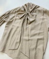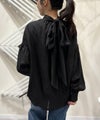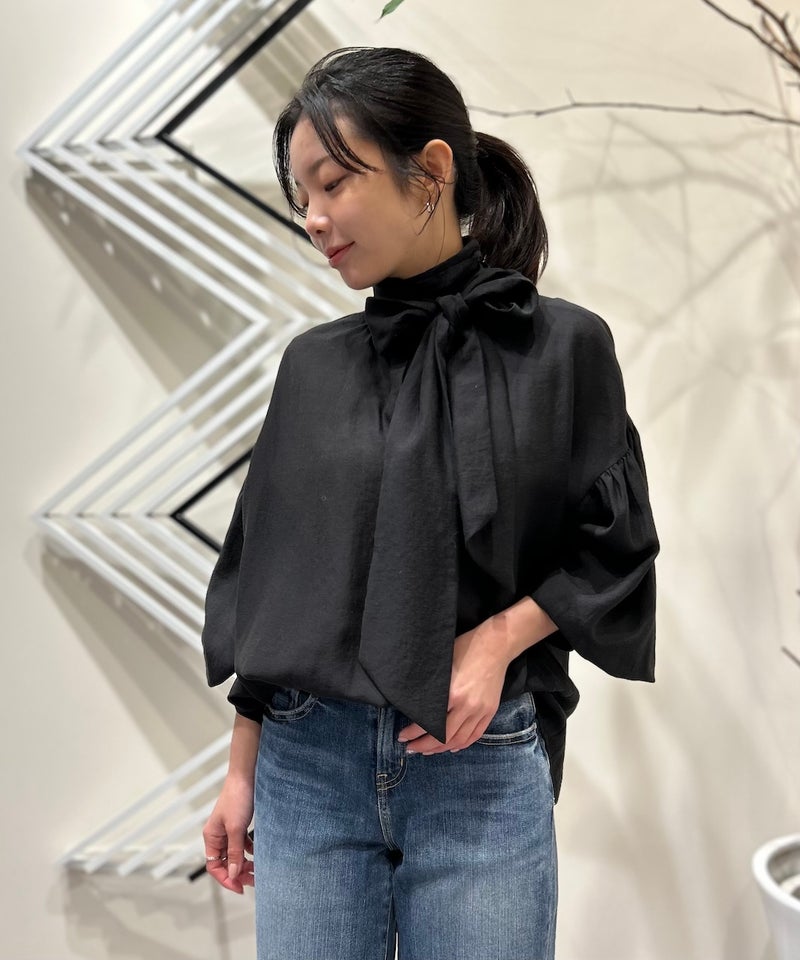 上品な微光沢感とシアー感のある生地を使用したボウタイブラウス。前後どちらでも着用可能な2way仕様。長めのボウタイデザインは前でも後ろでも結べ、様々なアレンジが楽しめます。ふんわりとエアリーな素材感にボリューム感のある袖のシルエットもポイント。かしこまった場面からデニム合わせまで着回しが効き、ジャケットやジレとも合わせやすいアイテムです。