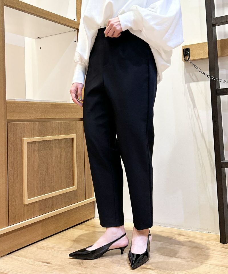 伸縮性が高く、綺麗な表面感に程良くコシのある素材を使用したテーパードパンツパンツ。ウエスト部分の裾にタックを施した、綺麗なテーパードシルエット。ウエストゴム仕様で全方向ストレッチ性があり、快適な履き心地です。