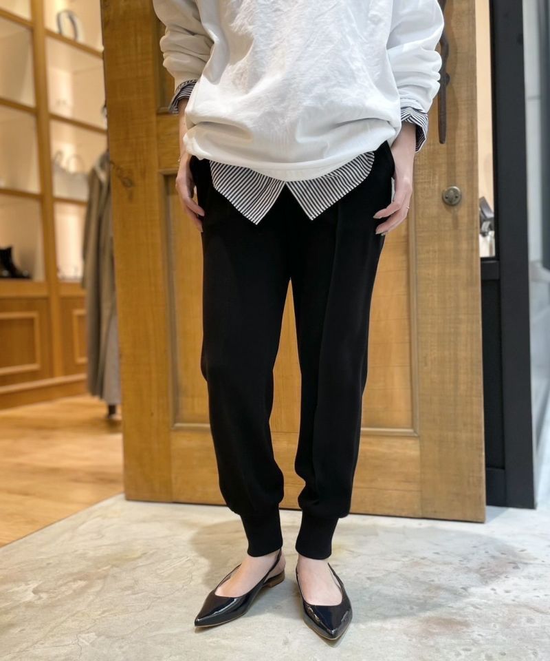 上品で落ち感のあるアセテート素材を使用したジョガーパンツ。腰回りにタックの無いスッキリとしたシルエットとセンタープレス入りで綺麗に着こなせる大人なアイテム。ボリュームのあるトップスやシャツと高相性です。※裏地無し、ポケット付き、ウエストゴム仕様。
