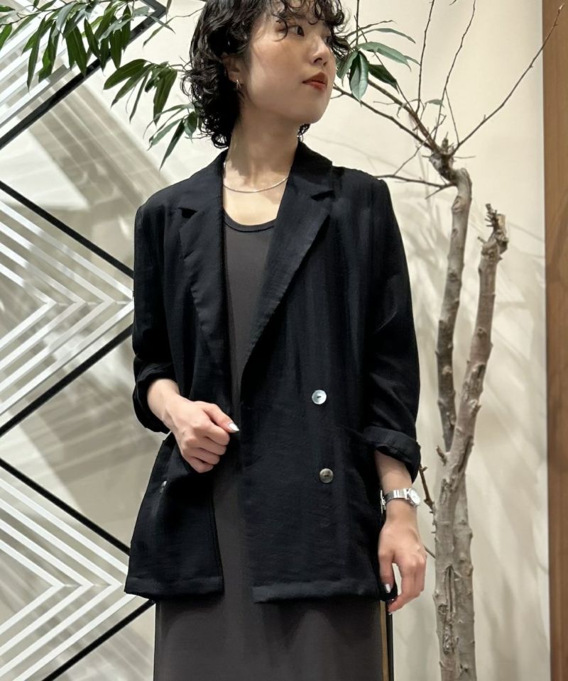程良いラフさが魅力の軽く羽織れるテーラードジャケット。ダブルボタンのきちんと感もありつつ、程良くゆるさのあるシルエット、柔らかくナチュラル感のある素材でカジュアルスタイルにも取り入れやすいアイテム。裏地が無く気軽に羽織りやすく、袖をアップした着こなしもしやすい。秋のスタートにもおすすめな素材です。※ポケット付き、スリット無し。