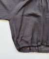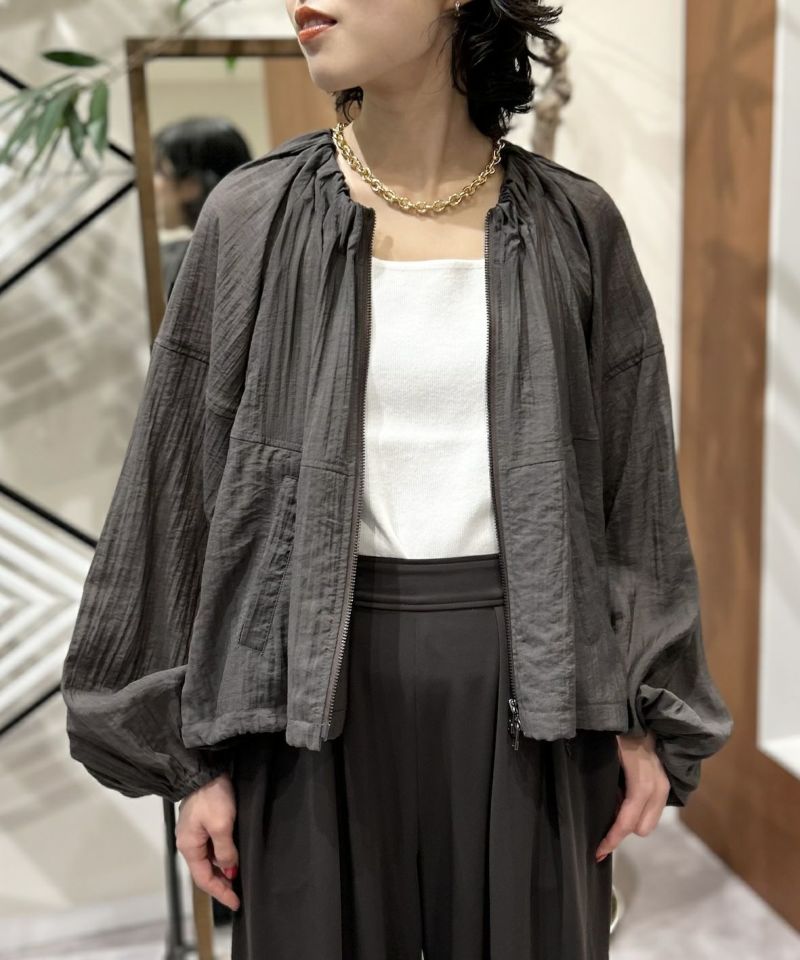 程良い透け感とシボ感のある素材を使用したラグランスリーブブルゾン。柔らかさとハリを兼ね備えた生地。首元や袖口に贅沢にギャザーを施した立体感のあるシルエットが女性らしいポイント。裾のコードを絞って、シルエットの調節が可能。軽い着用感で、暑い日の日除けや冷房対策にも活用できるアイテムです。※裏地無し、ポケット付き。
