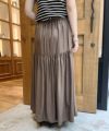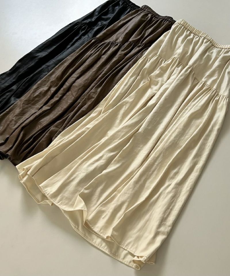リネンのようなシャリ感とレザーのような上品な光沢感が特徴のロングスカート。フェイクレザーのような重さが無く、軽やかな動きのある素材感。前から後ろに斜めに切り替え施された、細かなギャザーがポイント。フェミニンながらも大人っぽい雰囲気が魅力。カジュアルなTシャツ合わせから綺麗めのスタイリングまで活躍する一枚です。※ウエストゴム仕様、裏地有り。