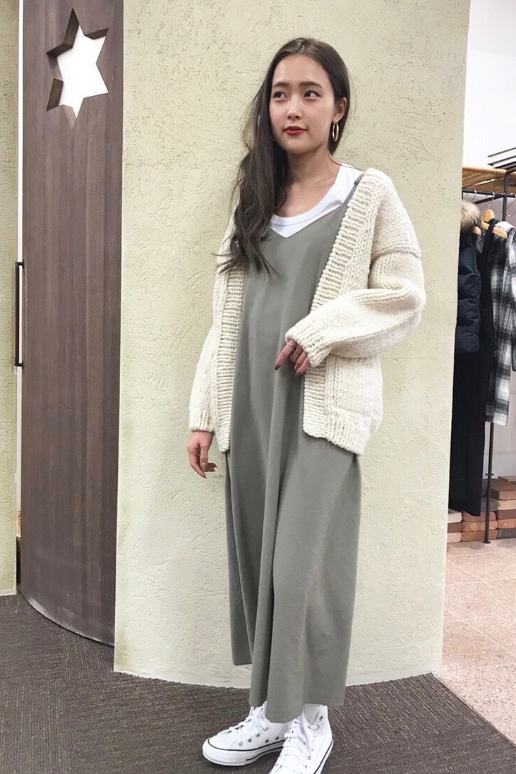 この冬大人気のハンドニットはペルーウールの上質素材、肩を抜いて抜け感を出して着こなしたい。合わせたのは落ち感が綺麗なグレージュカラーのオールインワン。