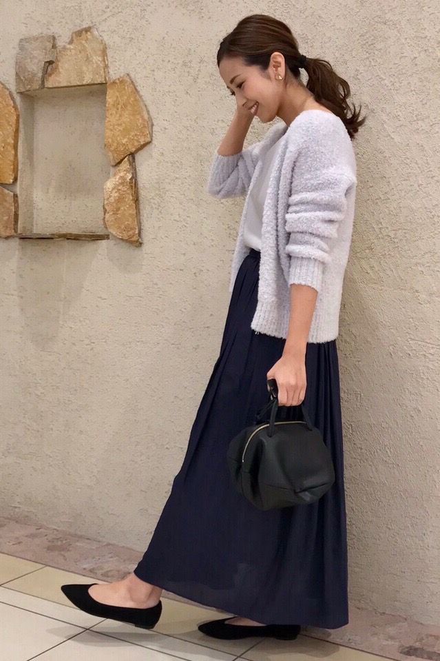 綺麗なサテンのロングスカートはふわふわニットと合わせてフェミニンにコーディネート。 色合いはスッキリ味にしてクールなカラーを選びました。