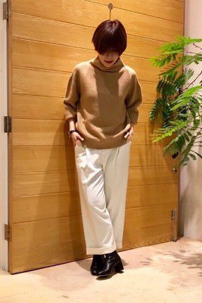 この冬にしたい、ホワイティなボトムスのコーディネートは、ベージュのニットと合わせて柔らかく女性らしい雰囲気。パンツはペグトップのセンタープレスでマニッシュさも足してくれるので甘すぎない印象にしてくれます!