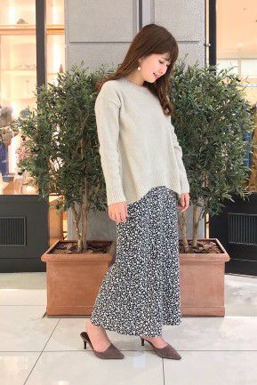ひらりとロングフレアラインのスカートもこの冬取り入れたいボトムスライン。今からのふわりとしたボリューム、ゆるニットとの相性も良い。ふわっとした柔らかな質感が贅沢なFOX毛混ニットは着るだけでハッピーなふんわり感。小花柄プリントのどこかクラシックなスカートを合わせてふわっと+ゆるり+ひらりの女性らしいけど古臭くならないコーディネートです。
