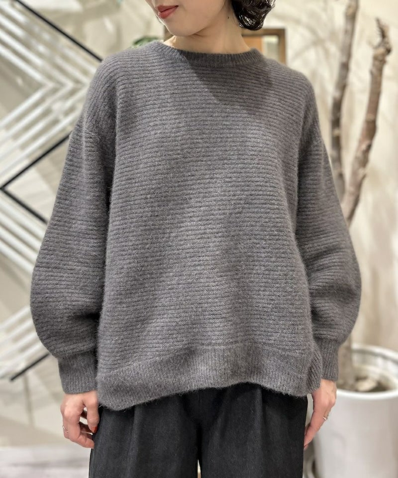 軽くて保温性がある肌触りの良い、毛足の長いチャイニーズラクーンを50%ブレンドしたニットプルオーバー。横編みの表面感と、立体感のあるフォルム、袖の程良いボリューム感が魅力。着るだけで上品なアイテムです。