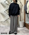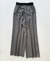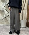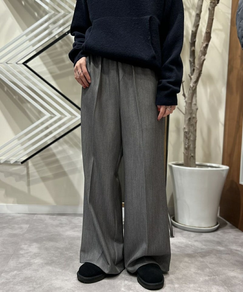 スーツのような綺麗見えする表面感に、程良くストレッチが効いたソフトな風合いが持ち味のTRストレッチ素材を使用したスラックスパンツ。センタープレス入りのスッキリとした程良いワイドシルエット。ウエストは配色の黒のゴム仕様、アクセントにもなり着心地も快適。キレ目のトップスにもカジュアルなトップスにもコーディネート可能な一枚です。※裏地無し、サイドポケット付き(バックポケットのみフェイク)。