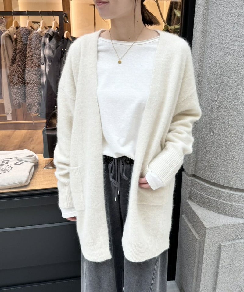 軽くて温かく、ふわふわとした表情のあるラクーン混ニットを使用したロングカーディガン。ボタンの無いスッキリとシンプルなデザイン。女性らしい質感、優しいカラーリングが魅力です。※ポケット付き。