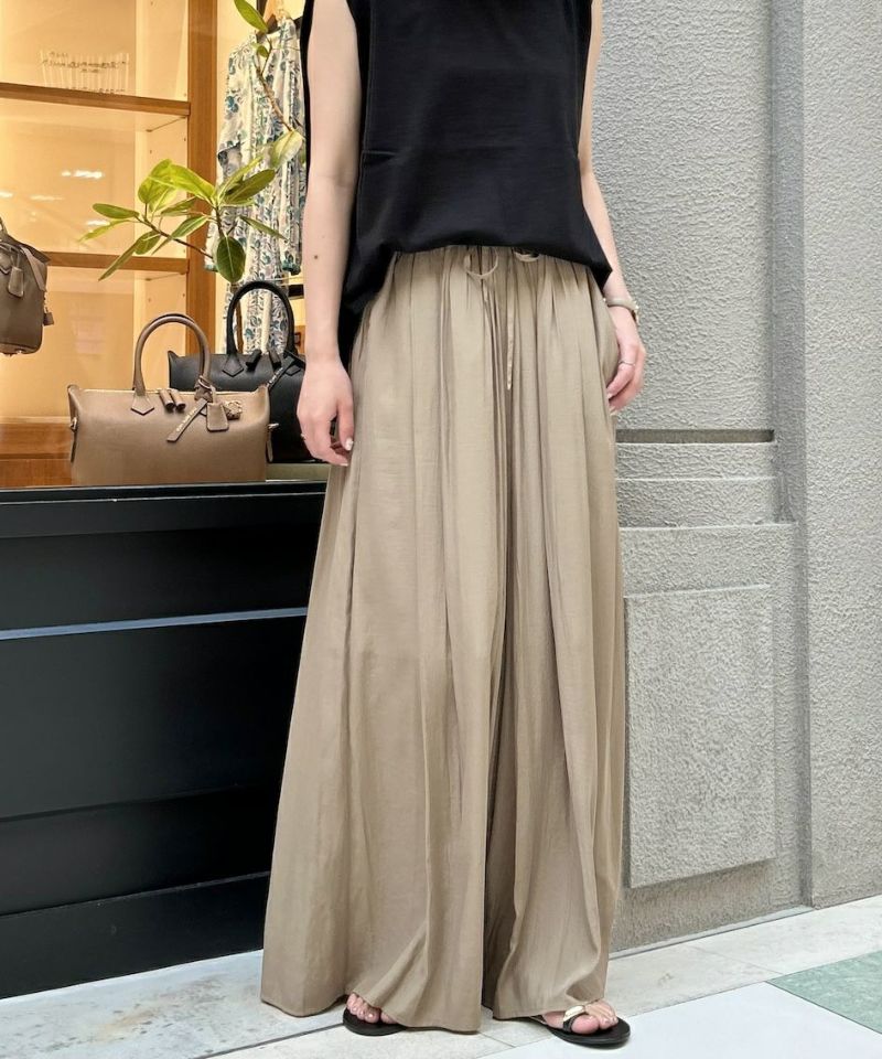 軽量で落ち感のあるサテン生地をたっぷりと使用した雰囲気感のあるワイドパンツ。ウエスト部分に贅沢に施されたギャザーがラグジュアリーな印象。上品な微光沢感があり、サマーニットやTシャツ合わせもサマになるアイテム。ゴム仕様のウエストでイージーな履き心地も暑い季節には嬉しいポイントです。※サイドポケット付き、膝丈までの裏地付き。