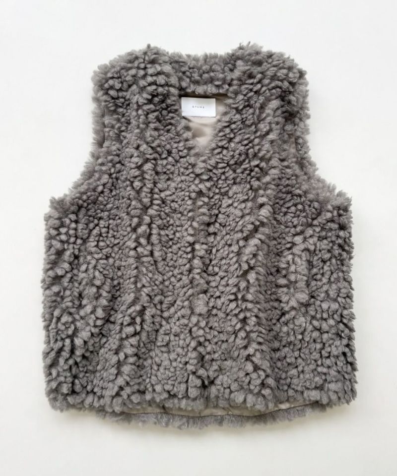 束感のある大きめのカーリーファーが目を惹くベスト。インパクトのある素材にショート丈が好バランス。やや後ろ下がりのラインで横からのシルエットも◎。柔らかく軽い着心地も魅力です。※裏地付き、フロントホック付き。