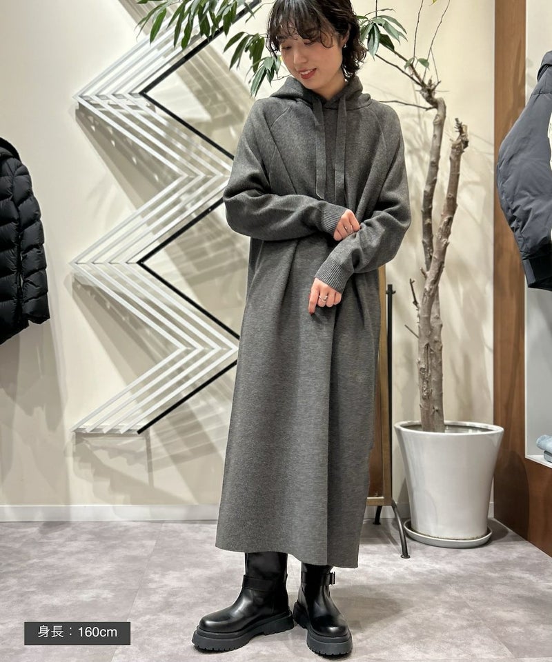 肌触りが良く、もっちりとした弾力とストレッチ性のあるノンウール素材を使用したフーディーニットワンピース。ストンとしたゆとりのあるシルエットでリラックス感のある一枚。フード部分の共布の太めの平紐がアクセントになっています。バックスリット入りで足捌きも◎。