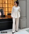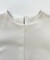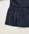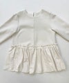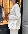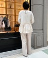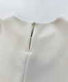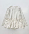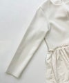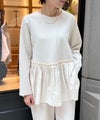 スポンジのようなハリと弾力のあるダンボールニット素材に、裾のタフタ切り替えがアクセントになったプルオーバー。一枚で華やかで女性らしく、セレモニースタイルから日常使いまで活躍する一枚。バックスタイル首元のパールボタンもさり気ないポイントです。