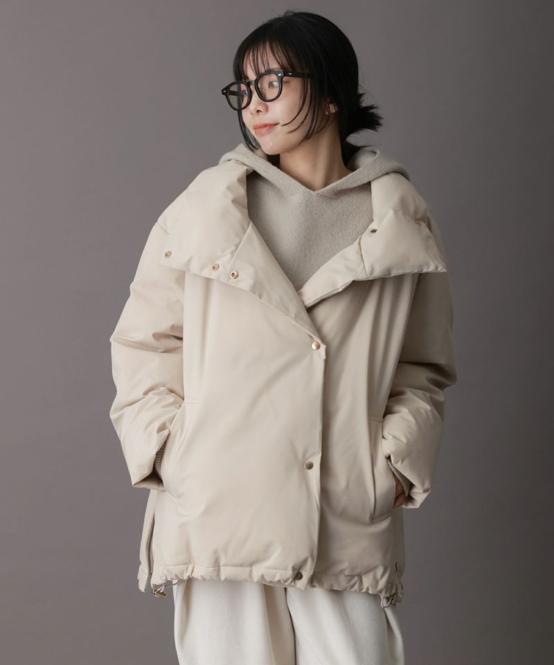 カジュアルさを抑えたマットなタフタ生地を使用した、ノンステッチで綺麗見えする中綿ショートコート。スタンドになる高めの襟は寝かせてコート風に着用しても◎。中綿にはファイバーダウンを使用。ポリエステル繊維を細かく加工し、ダウンのような保温性や軽さ柔らかさを兼ね備えた機能性素材。裾のサイドジップや調節可能なドローコード、バックスタイル裾のボタンでシルエットの変化が楽しめる一枚。しっかりと防寒しつつ、綺麗見えも叶うアイテムです。※サッドポケット付き。