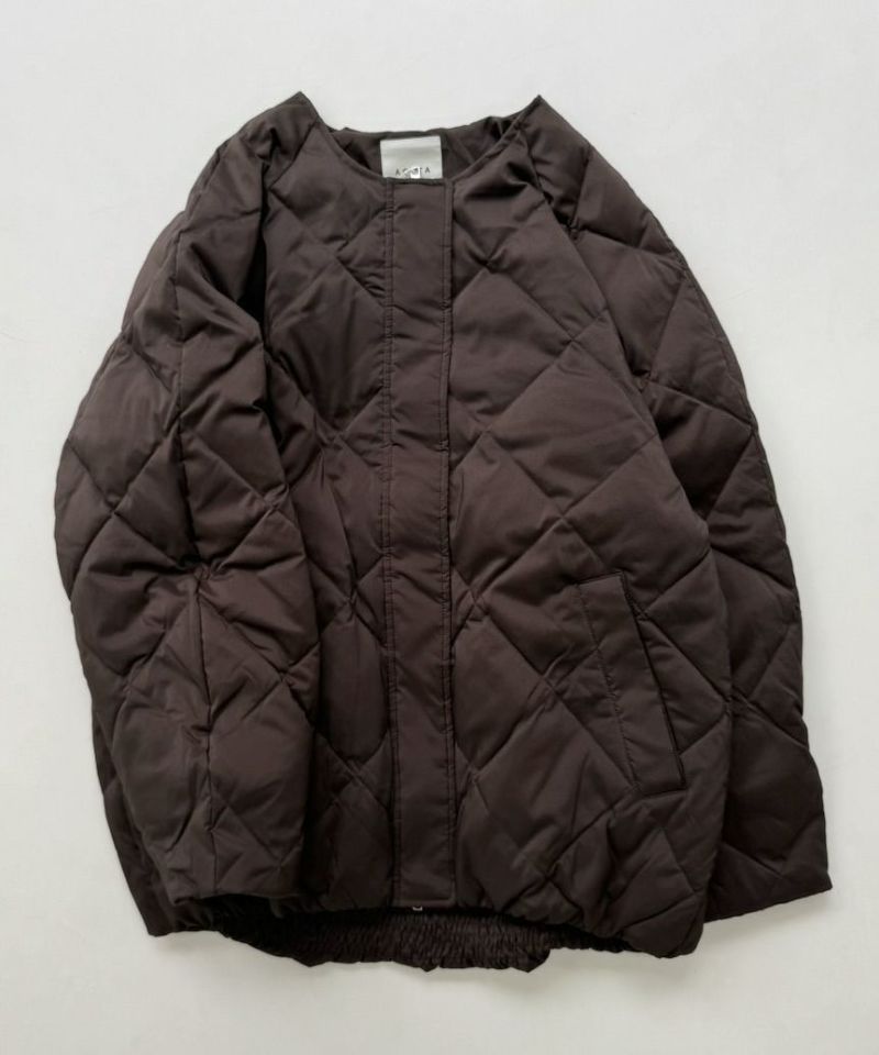 真冬まで活躍する保温性に優れたダウンコート。気軽に着こなしやすいスッキリとしたノーカラーデザインにショート丈。光沢を抑えたマットな素材感にダイヤキルティング、程良く立体感のあるバナナスリーブがファッショナブルな印象。毎年人気のアイテムながら、今期はストレッチタフタ生地に袖口内側にはリブが施され、着心地の良さがUP。表面には汚れ防止・静電気防止・撥水加工が施されています。※撥水加工は永久的なものではなく、着用・強い摩擦・クリーニングを繰り返す事により効果は低下していきます。※ポケット付き。