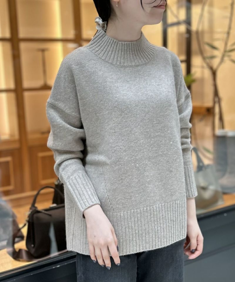 保温性が高く滑らかな肌触りが魅力のヤクとカシミヤ混素材を使用したハイネックニット。シンプルなシルエット、程良い肉感でコートの中にも着やすく、着回しの効く一枚。バックスタイルの襟元や裾のスリットがアクセントになっています。