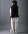 ふわふわとした肌触りの良いラビット調のエコファー素材を使用したベスト。すっぽりと着用できるハイネックのプルオーバーが新鮮。ゆとりのあるネックライン、広めのアームホールにワイドな裾幅で様々なトップスと重ね着が可能。コートの中にも収まりが良く、コーディネートのアクセントになる一枚です。開閉可能なサイドボタン付きです。