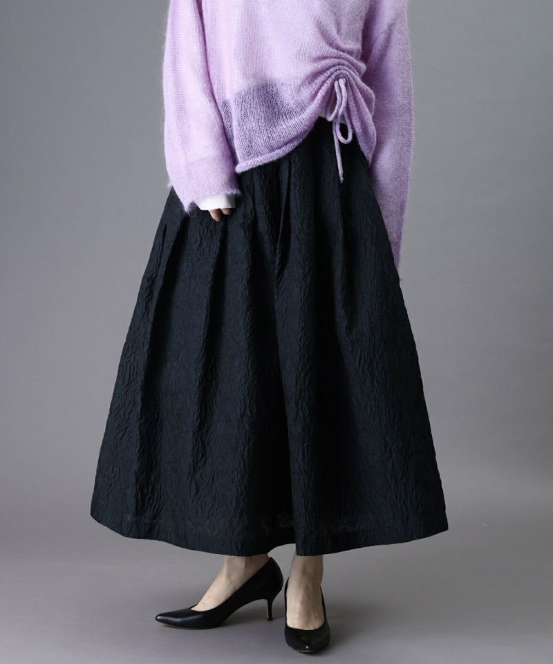 上品なジャガード素材が目を惹くフレアスカート。たっぷりと施されたタックで女性らしい立体感のあるフォルムを表現。ゴム仕様のウエストで履き心地も良く、快適なフィット感のある着心地。シンプルなニット合わせが映える華やかな一枚です。※裏地付き。